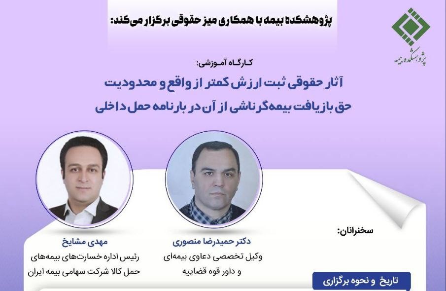 \r\n\r\nبه گزارش مراقب بیمه به نقل از روابط عمومی پژوهشکده بیمه، در این نشست آموزشی محورهای «بررسی فرآیند حال حاضر صدور بارنامه و بیمه مسئولیت متصدیان حمل در ایران»، «بررسی آییننامه ۸۷ شورایعالی بیمه»، «بررسی باب هشتم قانون تجارت ماده ۳۷۷ الی ۳۹۴»، «اثر ارزشگذاری صحیح کالا در بارنامه بر میزان جبران خسارت و فرایند بازیافت حق بیمه» و «جایگاه ارزشگذاری واقعی کالا در بارنامه در دعاوی خسارت و بازیافت از متصدیان حمل (بررسی اساس ماده ۳۰ قانون بیمه)» توسط آقایان «دکتر حمیدرضا منصوری، وکیل تخصصی دعاوی بیمهای و داور قوه قضاییه» و «مهدی مشایخ، رئیس اداره خسارتهای بیمههای حمل کالا شرکت سهامی بیمه ایران» ارائه خواهد شد.
