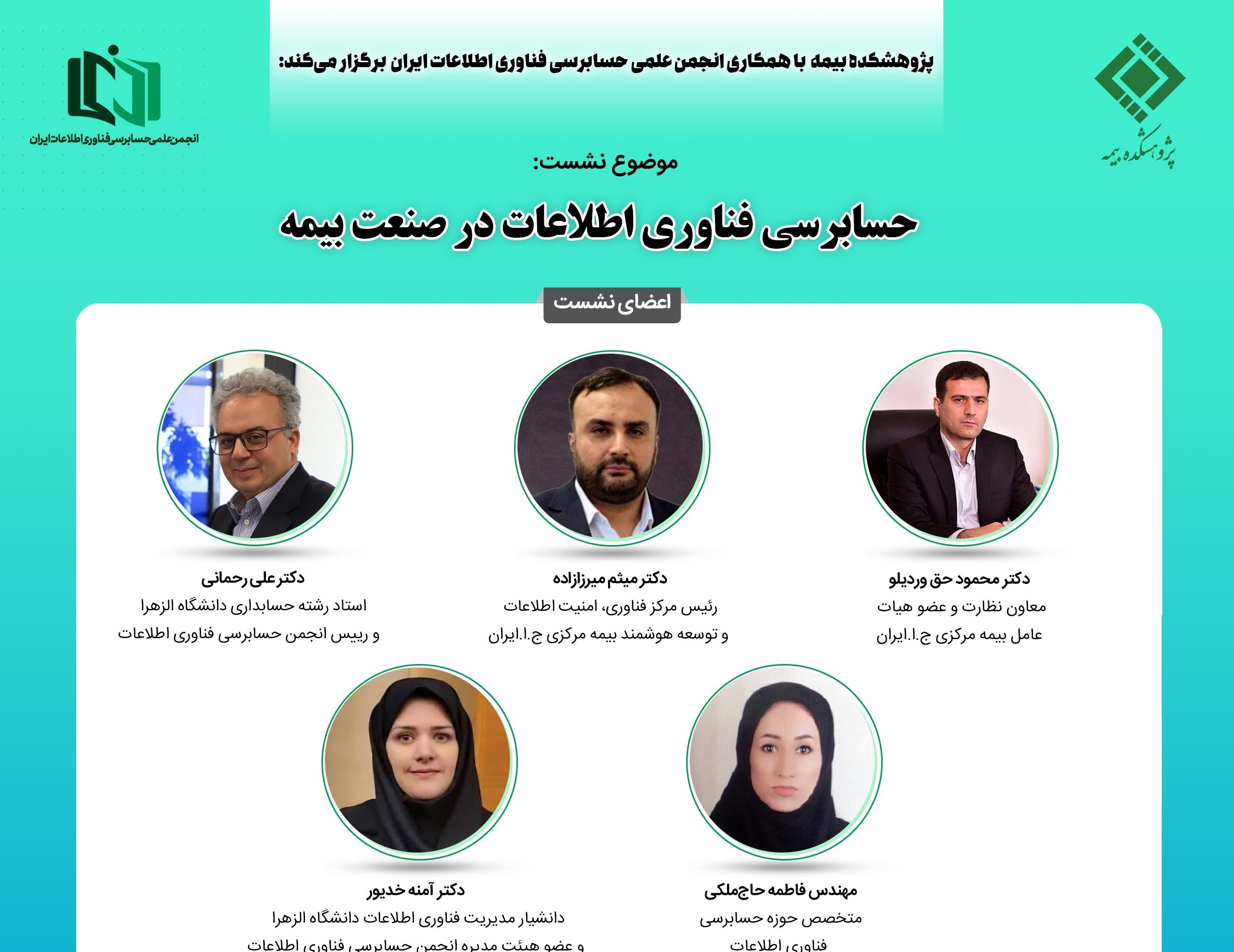 \r\n\r\nبه گزارش مراقب بیمه به نقل از روابط عمومی پژوهشکده بیمه، در این نشست آموزشی محورهای «ضرورت حسابرسی فناوری اطلاعات در صنعت بیمه»، «چالشها و ریسکهای فناوری اطلاعات رایج در شرکتهای بیمه»، «معرفی حسابرسی فناوری اطلاعات و جایگاه آن در حاکمیت شرکتی»، «چارچوبها و استانداردهای بینالمللی حسابرسی IT» و «ظرفیتسازی و توسعه مهارتهای حسابرسی IT در صنعت بیمه» توسط آقایان «دکتر محمود حق وردیلو، معاون نظارت و عضو هیات عامل بیمه مرکزی ج.ا.ایران»، «دکتر میثم میرزازاده، رئیس مرکز فناوری، امنیت اطلاعات و توسعه هوشمند بیمه مرکزی ج.ا.ایران»، «دکتر علی رحمانی، استاد رشته حسابداری دانشگاه الزهرا و رییس انجمن حسابرسی فناوری اطلاعات»، و خانمها «مهندس فاطمه حاج ملکی، متخصص حوزه حسابرسی فناوری اطلاعات» و «دکتر آمنه خدیور، دانشیار مدیریت فناوری اطلاعات دانشگاه الزهرا و عضو هیئت مدیره انجمن حسابرسی فناوری اطلاعات» ارائه خواهد شد.