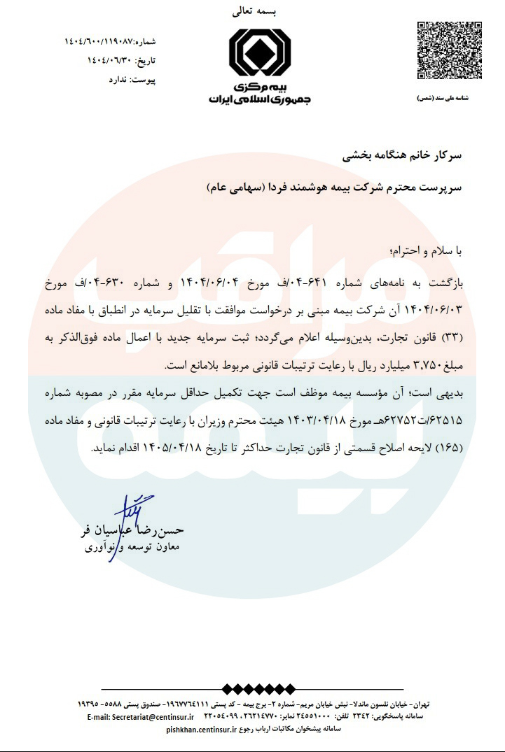 \r\n\r\n", "is_title": false, "is_link": false, "news": 6071 } ], "type": "news", "created_at": "2025-09-22T10:58:22.700327", "news_type": "news", "is_banner": false, "is_chief": false, "is_special": false, "is_insurance": false, "is_person": false, "view_number": 4, "is_publish": true, "publish_at": "2025-09-22", "creator": "admin1", "writer": 10 }, { "id": 6070, "news_detail": [ { "id": 8282, "cover": "https://api.moraghebbime.com/media/photos/news/cover/myFile_WZh5prU.jpg", "created_at": "2025-09-22T09:35:49.026178", "publish_at": "2025-09-22", "header": "«بیمه هوشمند فردا»؛ کاهش سرمایه تا سقف مبلغ تادیه شده", "sub_header": ".", "person_name": null, "person_position": null, "homepage_description_for_chief": null, "brief_description": "", "news": 6070, "insurance_type": null } ], "ticket_num": 0, "writer_name": "مهتاب معبودی", "writer_detail": { "id": 10, "image_file": "https://api.moraghebbime.com/media/photos/writer/2405.jpg", "created_at": "2024-03-09T08:28:50.275318", "name": "مهتاب معبودی", "description": "روزنامه نگار", "position": "خبرنگار" }, "news_detail_multi": [], "news_tag_file": [], "news_image_file": [], "news_paragraph_file": [ { "id": 10069, "image_file": "EMPTY", "created_at": "2025-09-22T09:35:49.030613", "text": "مراقب بیمه : شرکت بیمه هوشمند فردا در خصوص درخواست تقلیل سرمایه خبر داد که درخواست این شرکت از بیمه مرکزی برای تقلیل سرمایه به مبلغ ۳٬۷۵۰ میلیارد ریال با رعایت ترتیبات قانونی مربوط بلامانع اعلام شده است.
