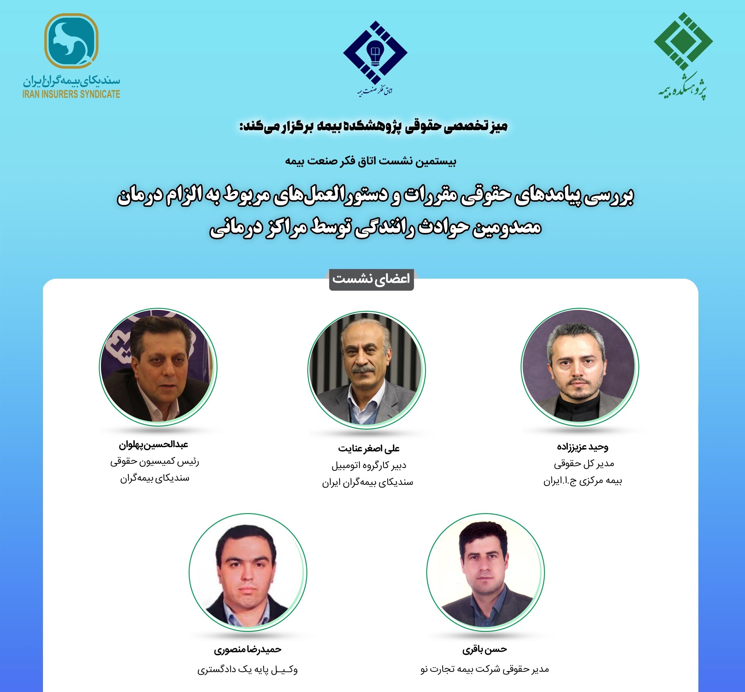 \r\n\r\nبه گزارش مراقب بیمه به نقل از روابط عمومی و امور بینالملل پژوهشکده بیمه، در این نشست، آقایان «وحید عزیززاده، مدیرکل حقوقی بیمه مرکزی ج. ا. ایران»، «علی اصغر عنایت، دبیرکارگروه اتومبیل سندیکای بیمه گران ایران»، «عبدالحسین پهلوان، رئیس کمیسیون حقوقی سندیکای بیمه گران ایران»، «حمیدرضا منصوری، وکیل پایه یک دادگستری» و «حسن باقری، مدیر حقوقی شرکت بیمه تجارت نو» در این خصوص به بحت و بررسی خواهند پرداخت.
