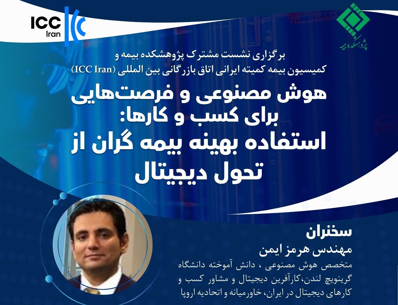 پژوهشکده بیمه با همکاری کمیسیون بیمه کمیته ایرانی اتاق بازرگانی بینالمللی (ICC ایران)، نشست تخصصی «هوش مصنوعی و فرصتهایی برای کسب و کارها: استفاده بهینه بیمهگران از تحول دیجیتال» را روز شنبه ۲۲ شهریورماه ۱۴۰۴ از ساعت ۱۰ تا ۱۲ برگزار میکند.